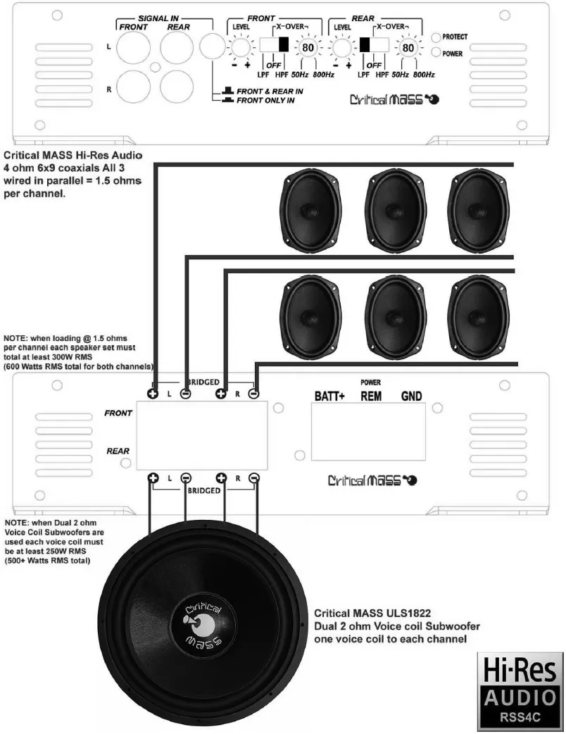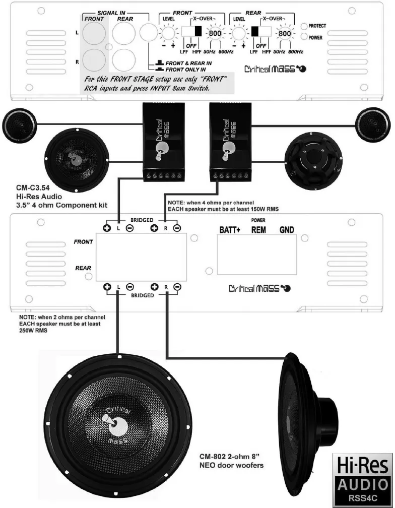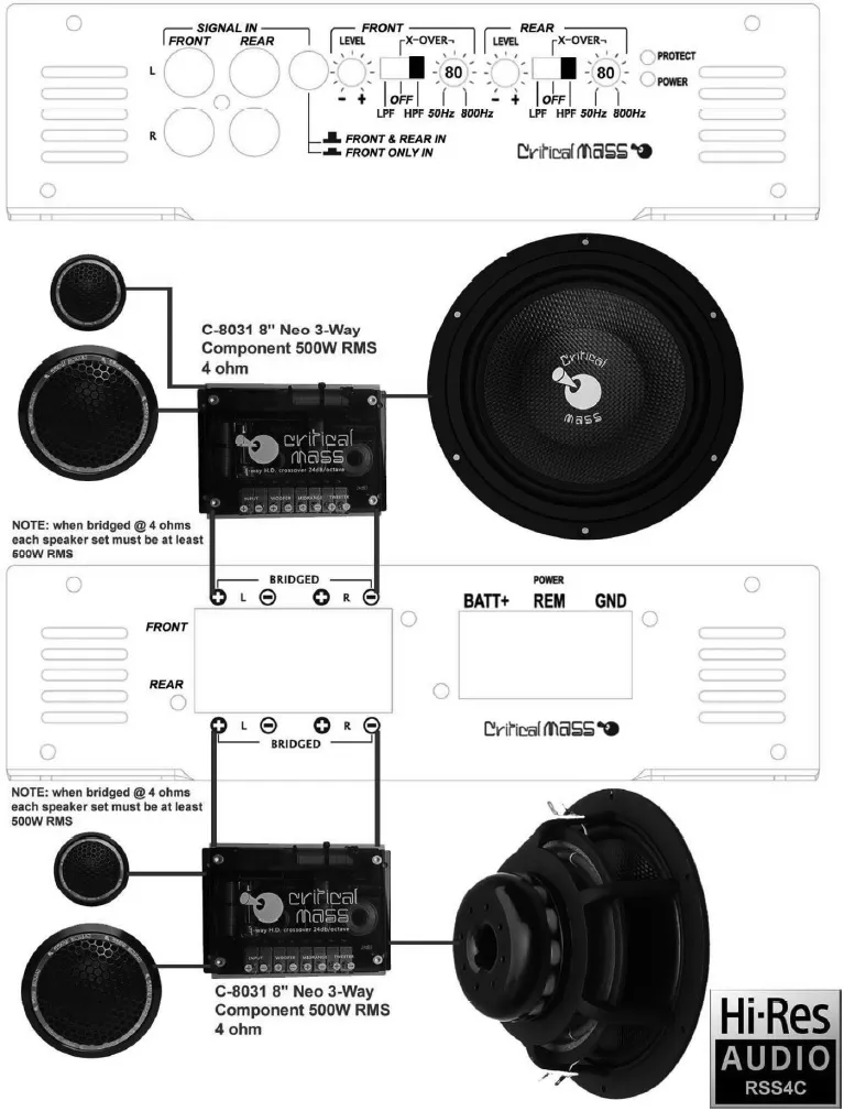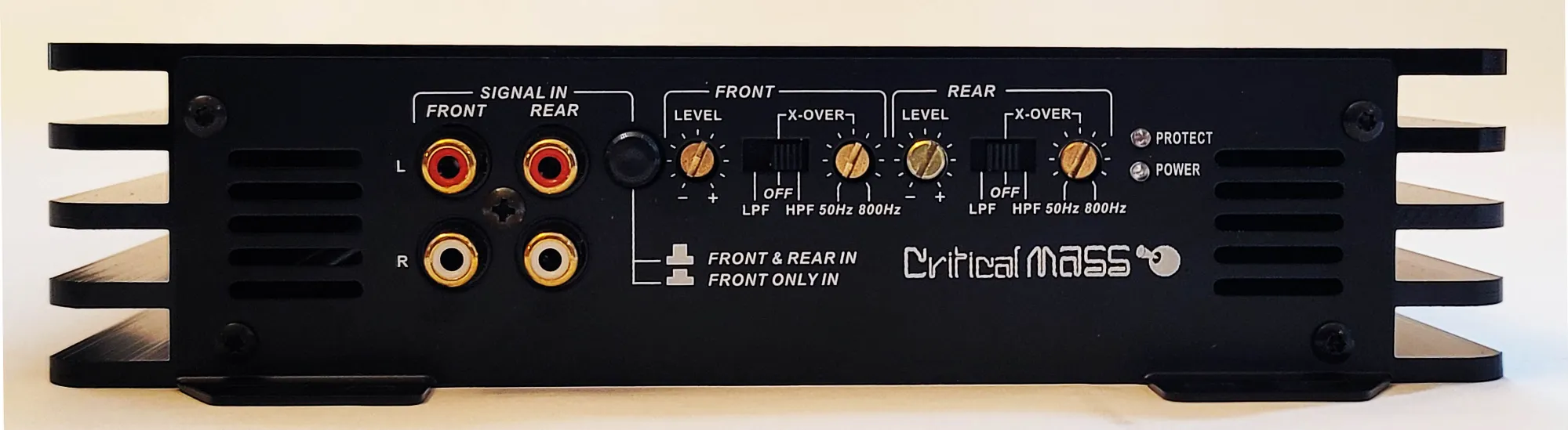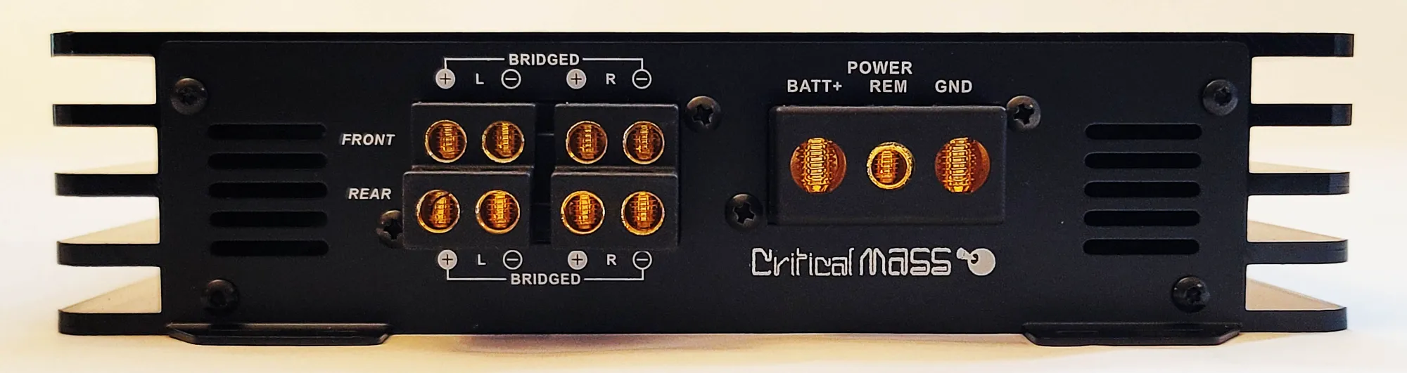 The Reference Series Amplifier is built using true Audiophile components. Critical MASS amplifiers are manufactured and tested to meet the highest component quality and control standards. Engineered to provide decades of musical enjoyment when installed and operated correctly. Critical MASS is a Car Audio company whose Super-Fi electronics have made innovation history in the world of high-end mobile sound ever since the early 1990s. Critical Mass was formed from the World's First Car Audio and Enhancement school by one of Car Audio's first innovators and most influential people in our industry who started the world's first Car Audio and enhancement school back in the late 1980s "CMA", from this school Critical MASS was started in Orlando, FL, in 1990. Till this day parts of the technical principles and teachings of our school are used industry wide in Mobile Electronics teachings and books by associations such as MERA and CEA. Over the past 20 years Critical MASS has continued to innovate and now we have been leading the way to max performance hi-fi on the road with our $259,000 CES-5.1 one of a kind Esoteric ESL sound system. Not only does Critical MASS make the Best and most expensive car audio system in the world, but this system (which integrates ELS Series amplifiers) is so good, that when Car Audio Magazine tested the least expensive part of our $259,000 ESL system "the UL12" called it the Perfect Sub", and "the BEST" and added that it was so good that he would sell a few things, to own one because it's worth every dollar! In addition, the Critical MASS UL12 was rated #1 over all others by Car Audio Magazine, including companies such as JL Audio, Image Dynamics, Alpine, Xtant, Kicker, Arc Audio, MB Quart, Digital Designs, Cerwin-Vega, Orion, Phoenix Gold Earthquake etc... In other words, imagine how good the rest of the system must sound if the least expensive pa rt of it is the world's BEST? You will not have to imagine much longer as you just purchased a Critical MASS amplifier. This Critical MASS Hi-Res Audio RSS4C Reference SS Amplifier uses a Class A/B designed heavily biased towards Class A at lower power levels, and eventually turns full A/B at full power. This is done to provide the sweet warm sound of yesteryears Tube and SQ Class A amplifiers with the efficiency of Class A/B. Although this design is slightly less efficient than traditional A/B amplifiers it’s way more efficient than Class A. This design is not only extremely powerful with plenty of dynamic headroom but sounds far superior compared to Class D and top-tier Class A/B designs. This Reference SS Amplifier is the perfect mix of top-tier sound quality efficiency and price. Pair with our Hi-Res Audio compatible speakers for an amazing audio experience. (See examples in manual). Representing Critical MASS’s most affordable amplifier line the Reference SS line ofAmplifiers makes no compromises at an attainable price level with sound quality that will impress even the sternest Audiophiles.